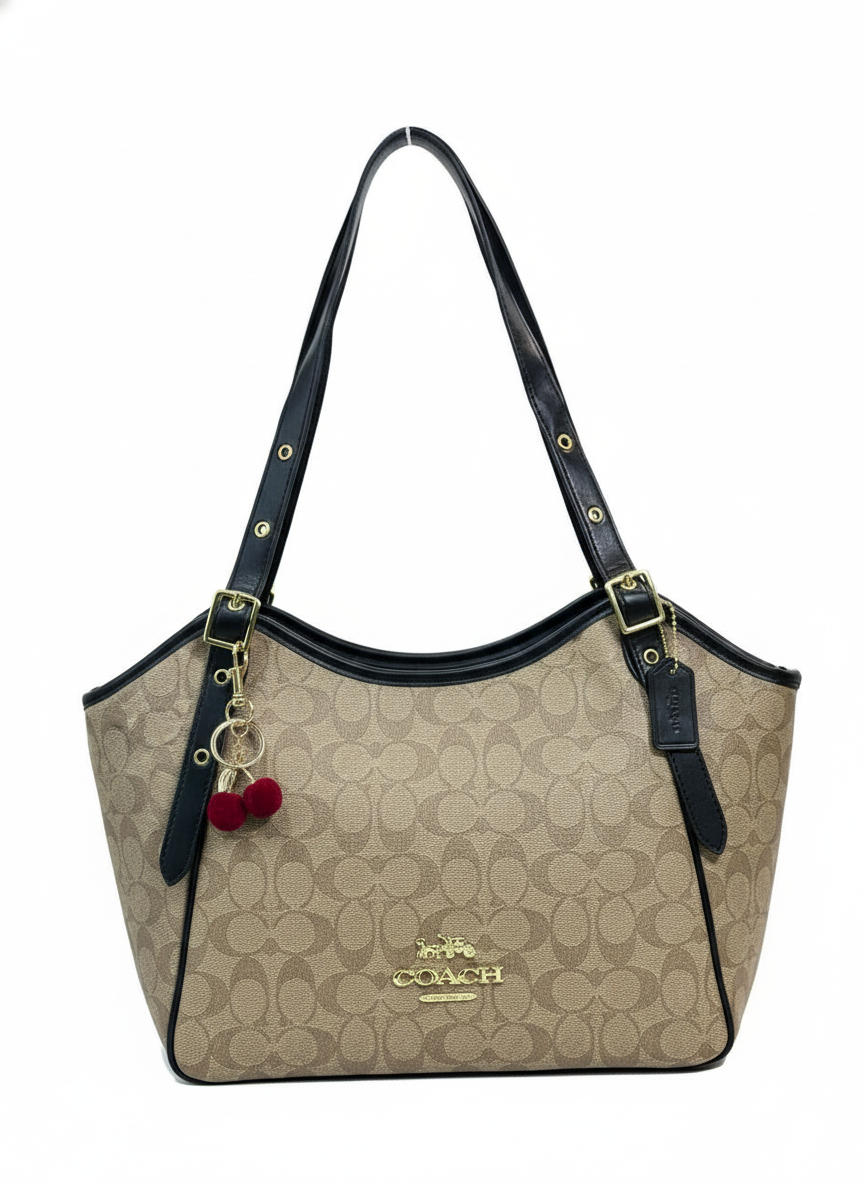 Luz y Estilo Orgánico. La versión más luminosa del icono. El lienzo en tono caqui suave se complementa perfectamente con los acabados en piel color caramelo tostado. Es una pieza que transmite frescura y es sumamente fácil de combinar con prendas claras o denim. El accesorio de cerezas le da un aire juvenil y sofisticado, ideal para esos días de sol o eventos casuales donde quieres destacar con sutileza.