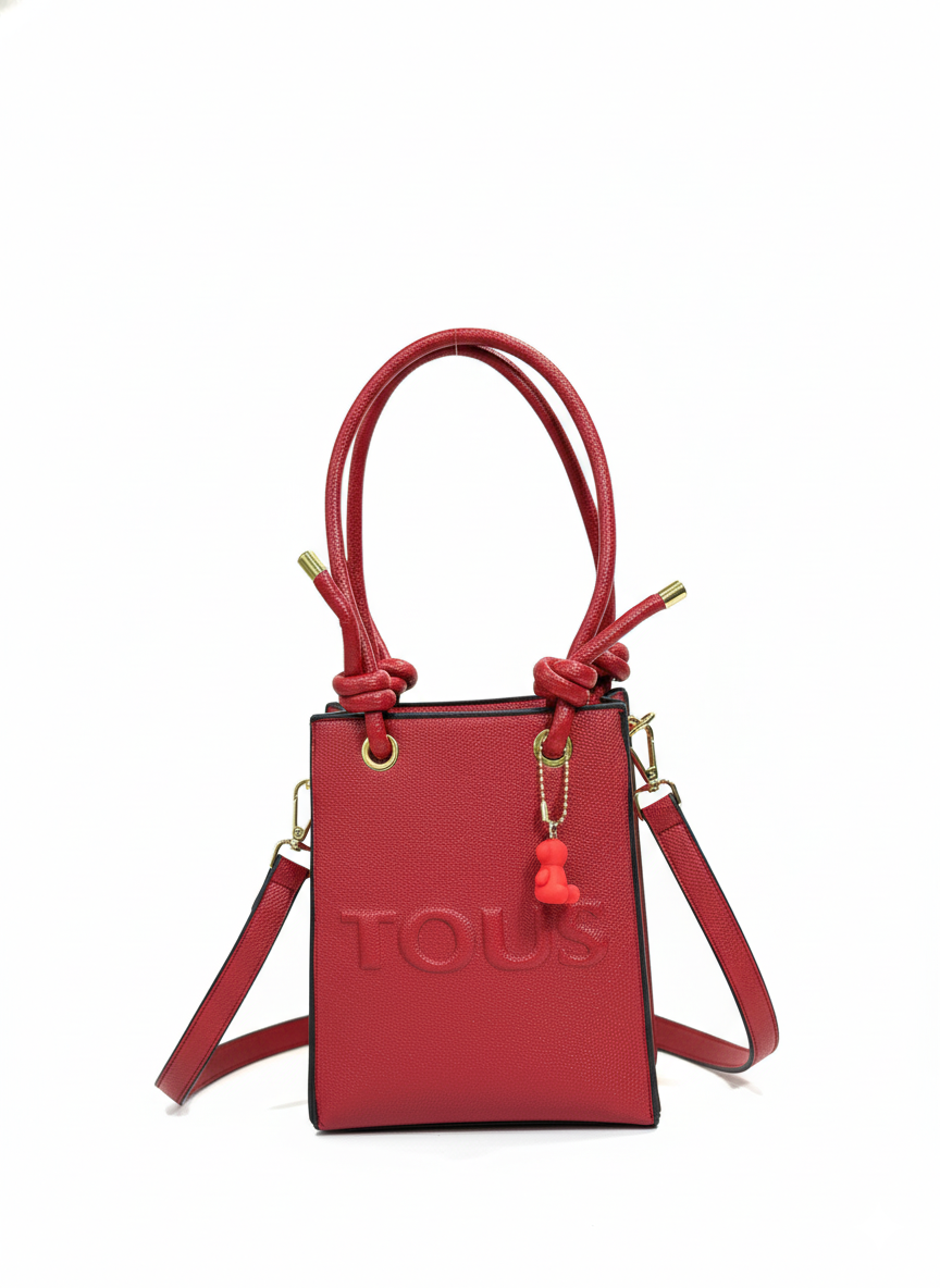 Audacia en cada detalle. Este es el bolso para la mujer que no quiere pasar desapercibida. El color rojo vibrante satura toda la pieza, desde el cuerpo estructurado hasta las asas con nudos artesanales. El logo en relieve frontal le otorga una textura tridimensional que grita exclusividad. Es el accesorio perfecto para romper la monotonía de un look neutro y proyectar seguridad y poder.